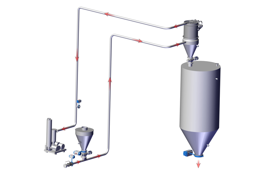 2:負(fù)壓連續(xù)式輸送是把傳統(tǒng)批次上料的真空上料器下方的氣動蝶閥更換為可連續(xù)喂料并具備一定鎖氣能力的旋轉(zhuǎn)喂料閥;